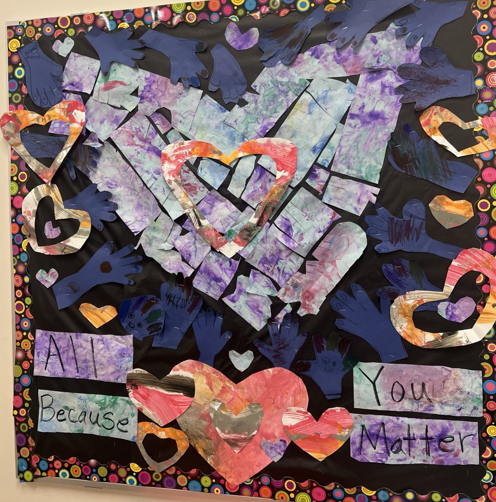 After reading, students used shaving cream and liquid watercolor to create a marbled painting. Then, they cut shapes with their marbled painting and I assembled into a heart for our classroom bulletin. Students also traced their hand and added details to their hand. I love how each unique hand holds a unique part of our classroom heart. 💜