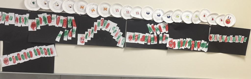 After reading, “The Very Hungry Caterpillar” students were handed a plate with something the caterpillar ate. When I called the food item, students brought their plate to the front of the classroom and we stapled it to our caterpillar. Look how long our caterpillar grew!