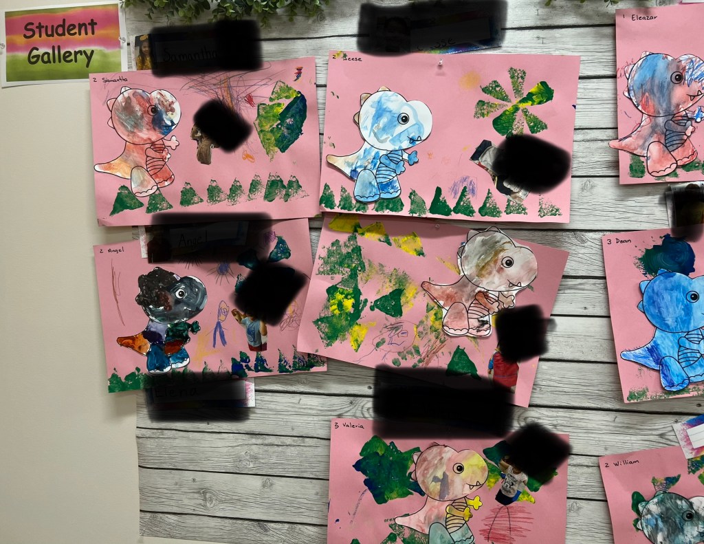 Students enjoyed the humorous story of, “We Don’t Eat Our Classmates” by Ryan T. Higgins. We used sponges and looked at photographs of palm trees to create a “Dinosaur Habitat” background. We then painted dinosaurs and took a photo of ourselves pretending to be scared!