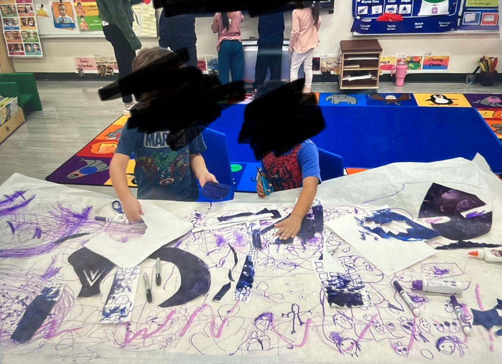After reading, we discussed all the things Harold drew. Then, I put large sheets of white paper on our tables with purple markers. Students enjoyed drawing some of the things Harold drew and adding some new drawings of their own.