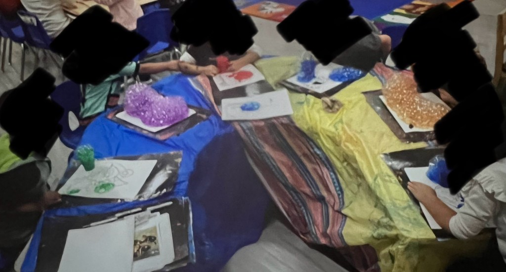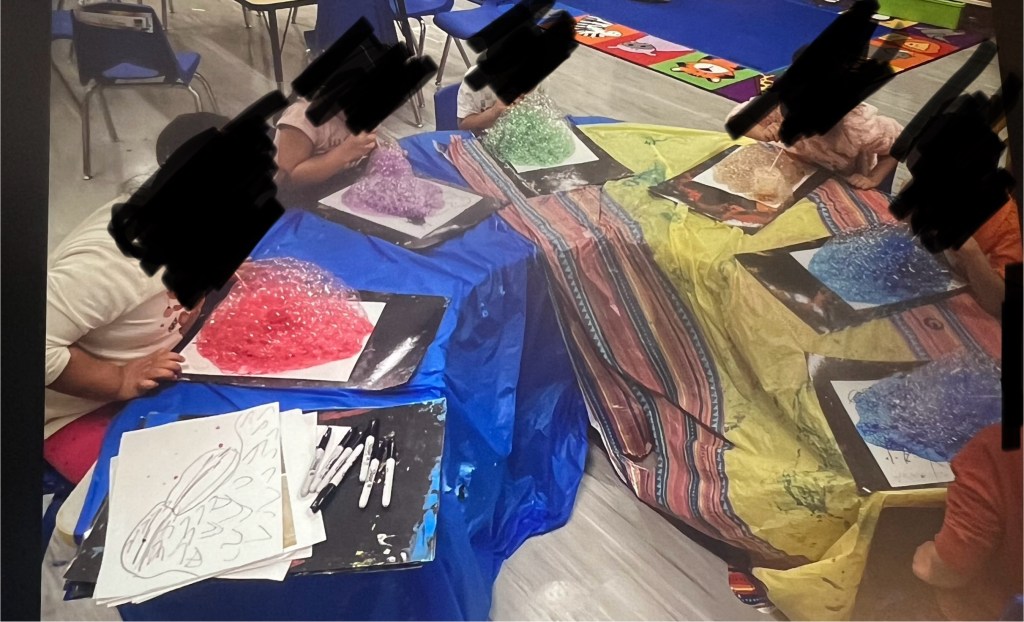A few weeks ago, students were using their juice box straws to blow bubbles in their milk. I asked students to please stop doing this and told them I’d find a bubble blowing task of some kind they could do instead. No sooner had I wondered how bubble painting works when an old dance friend had posted some bubble painting her children had completed in social media. She told me how to do it: paint, water, and dish soap in a cup either a straw. It was a piece of cake! A messy piece of cake, but a piece of cake nonetheless.