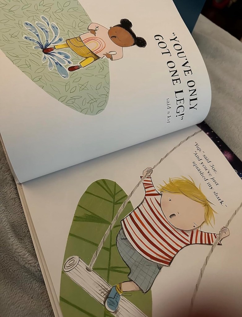 But he keeps getting questioned about his missing leg. He doesn’t want to talk about it. He just wants to play. So a girl joins him and they play!