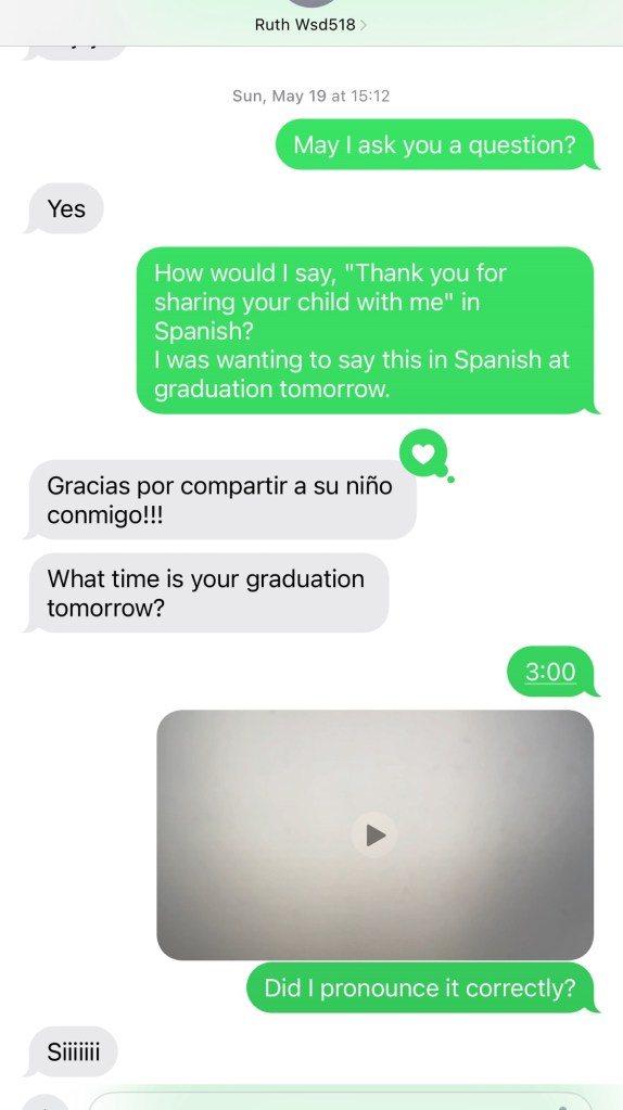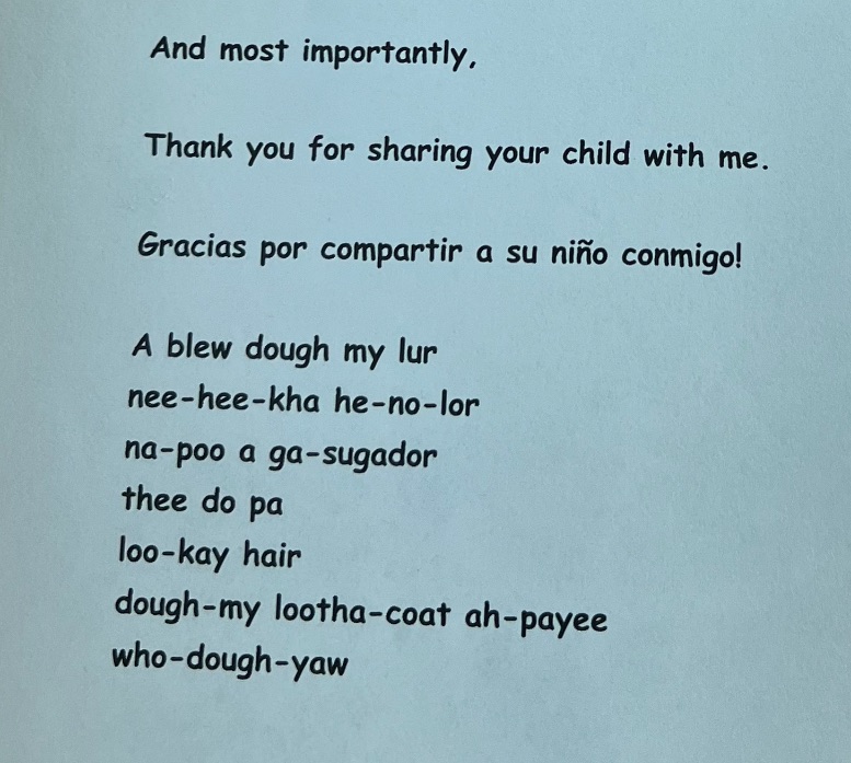 So I wrote my speech. For the last part of my speech, I wanted to thank parents for sharing their child with me. I then wanted to say this in the languages of my students: Spanish and Karen.